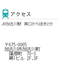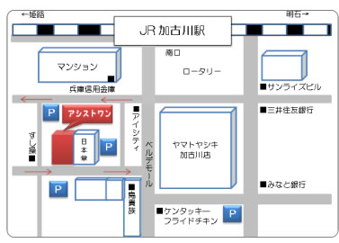 | 所在地 | ■本社 〒675-1202 兵庫県加古川市八幡町野村693-3 ■障害福祉サービス事業所 〒675-0065 兵庫県加古川市加古川町篠原町70-3第一ビル 2階 総合相談支援センター「アシストワン」 3階 就労移行支援事業所「アシストワンかこがわ」 |